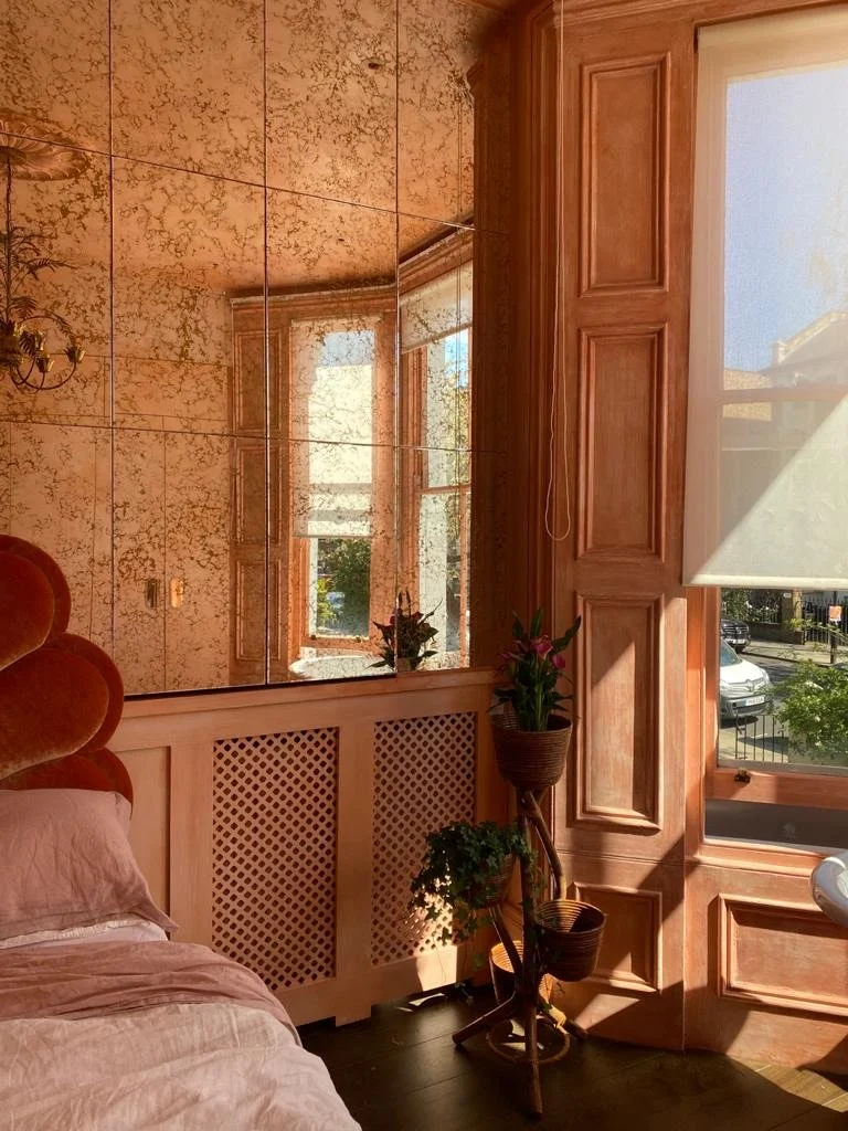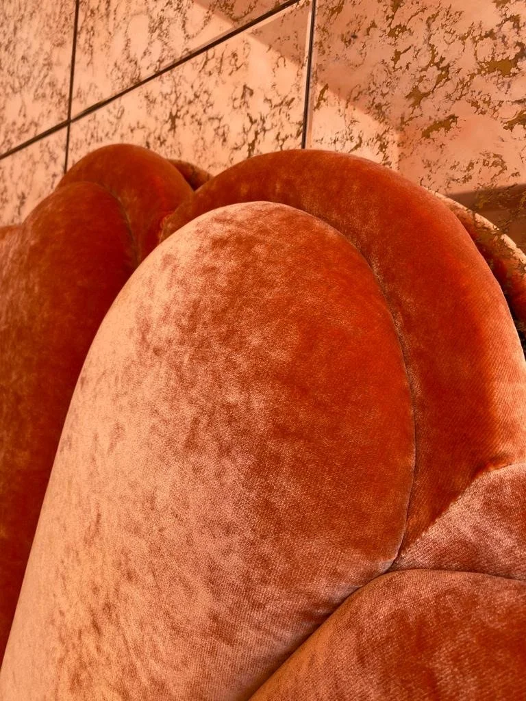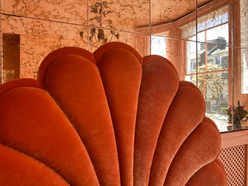 This headboard was made by our team to be a statement piece for the room. We recommended the velvet covering, as well as the scalloped form to fit with the style…..